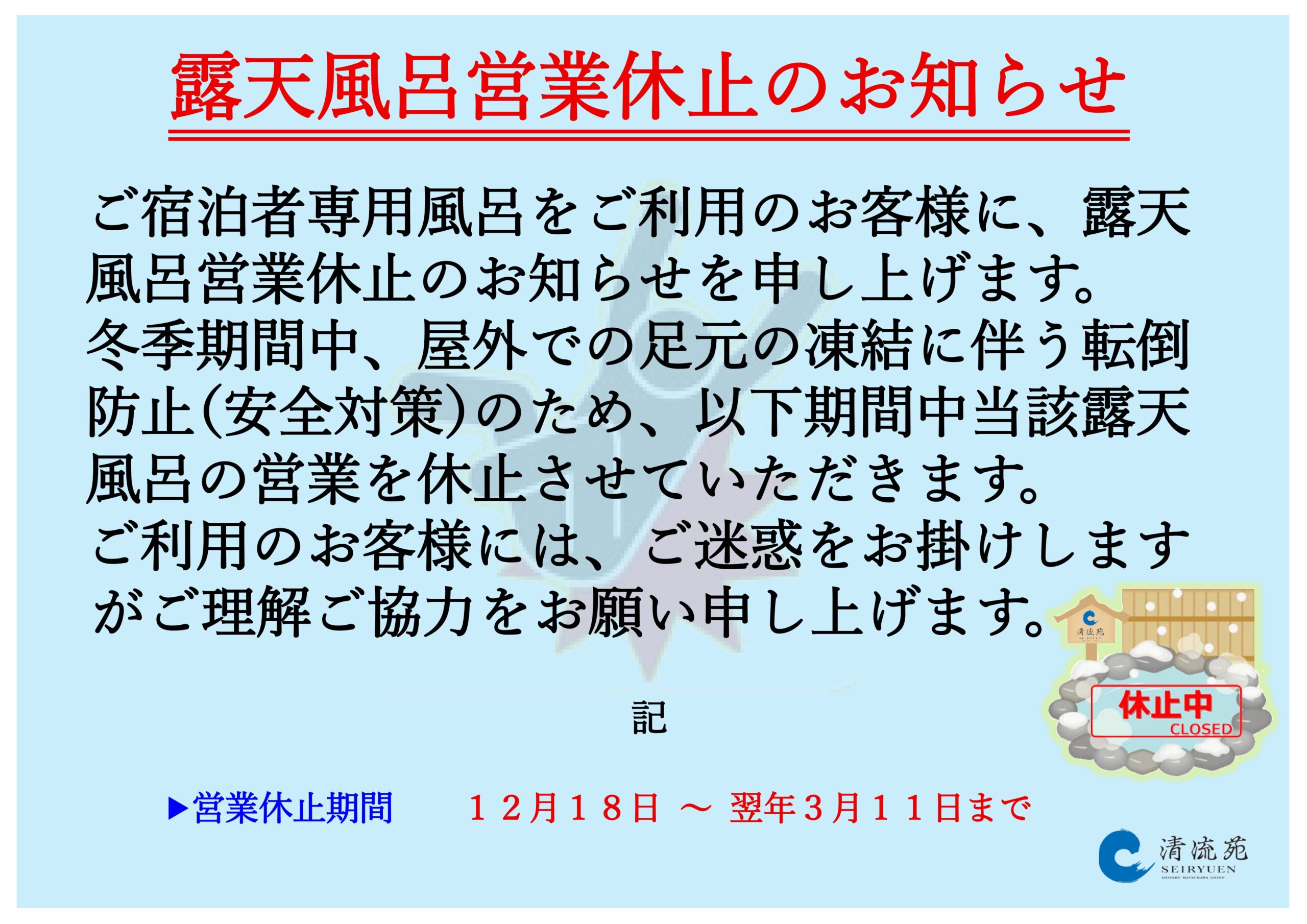 宿泊者専用露天風呂冬季期間中の営業休止のお知らせ